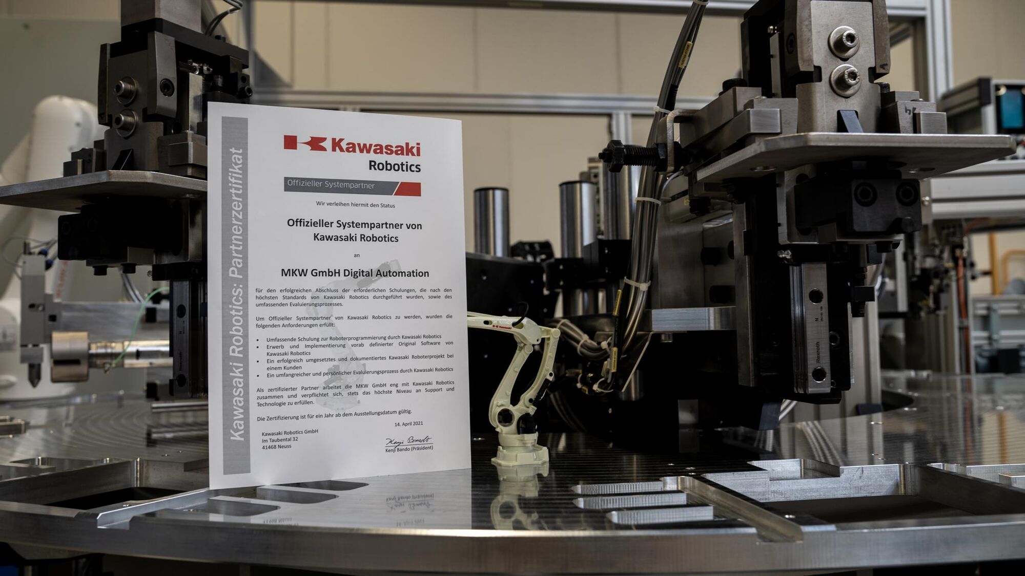 Wir sind sehr stolz, erneut als "offizieller Systempartner von Kawasaki Robotics" zertifiziert worden zu sein. Bereits seit vielen Jahren vertrauen wir auf die präzise Robotertechnik aus dem Hause Kawasaki und freuen uns auch in Zukunft auf eine professionelle Zusammenarbeit und spannende, gemeinsame Projekte.
